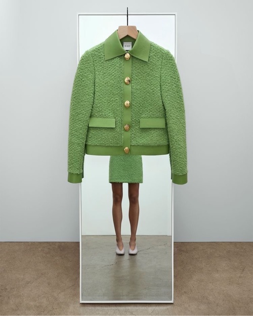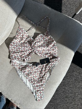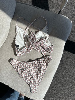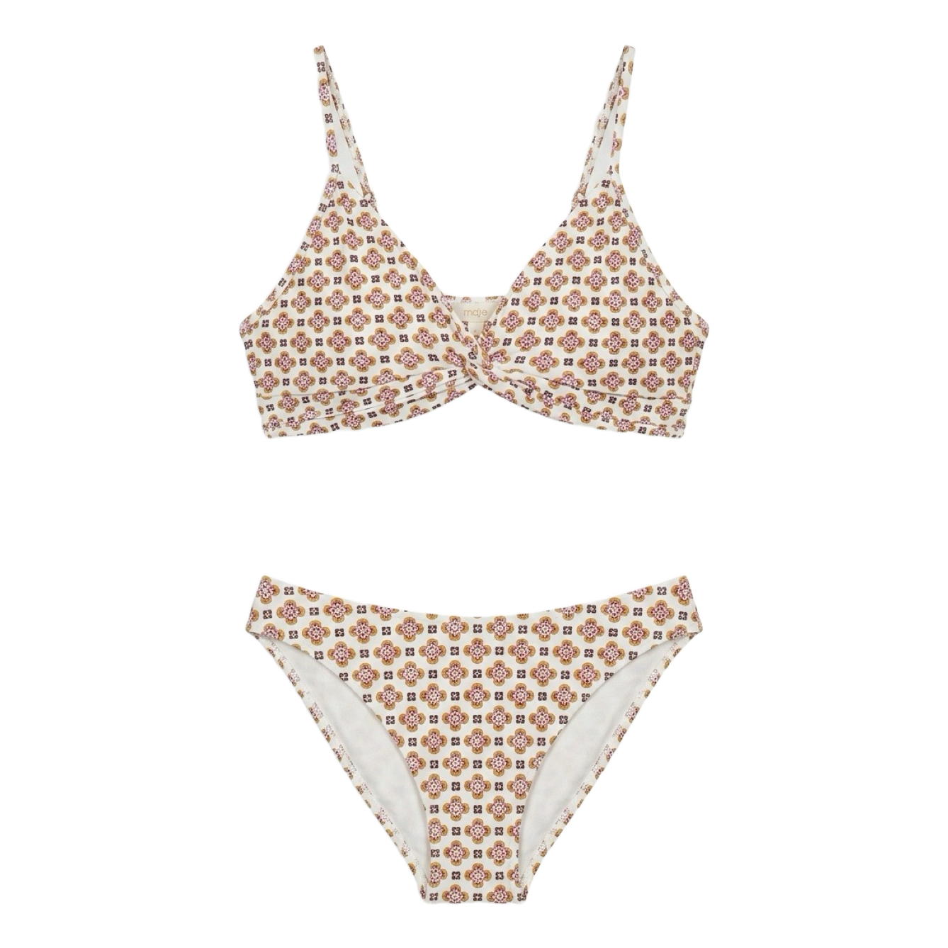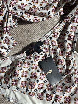 Maje two-piece bikini featuring a geometric print in white, pink, and orange. The top has a twist detail and the set comes with tags attached. Size 2.