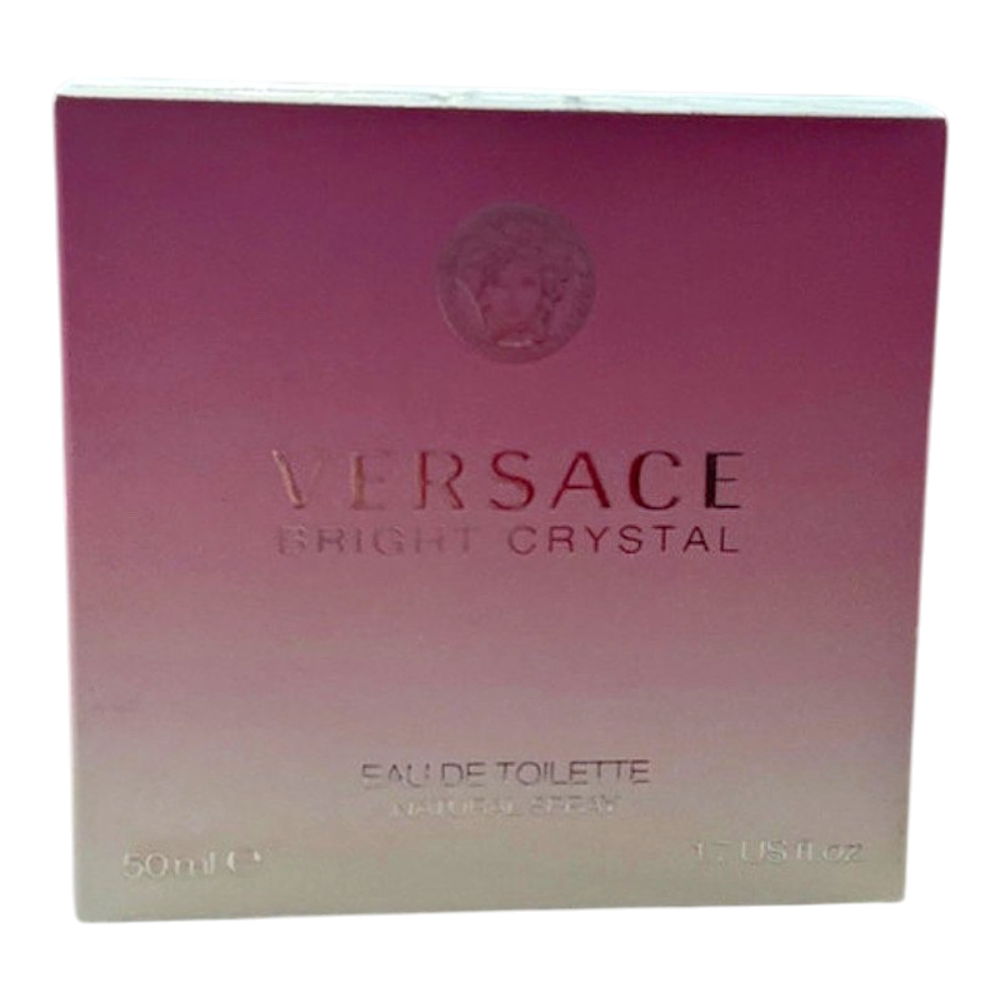 Versace Bright Crystal Eau de Toilette perfume. Pink liquid in a glass bottle. Packaging states 50 ml.