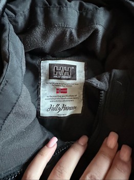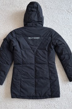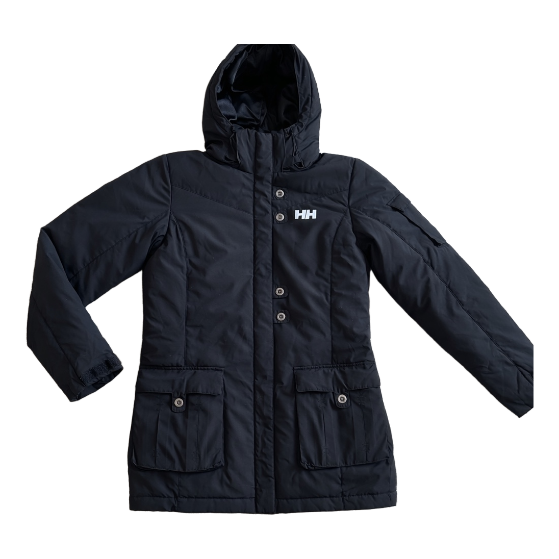 Black Helly Hansen jacket with a hood. Features front pockets and logo detailing on the chest and back.