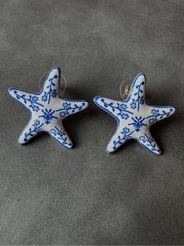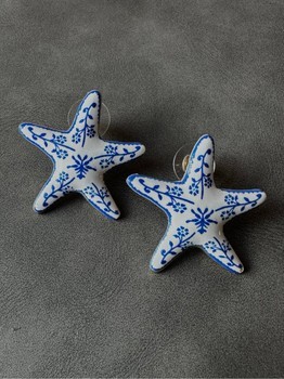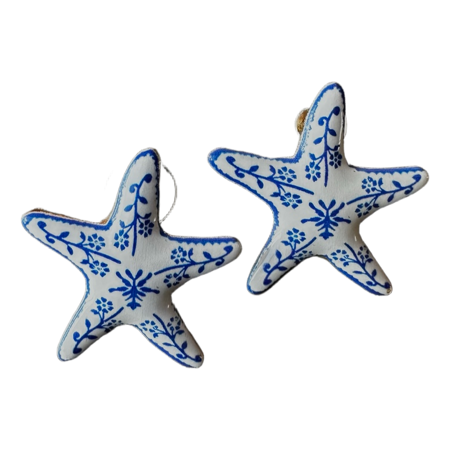 Pair of stud earrings shaped like starfish with a blue and white floral pattern.