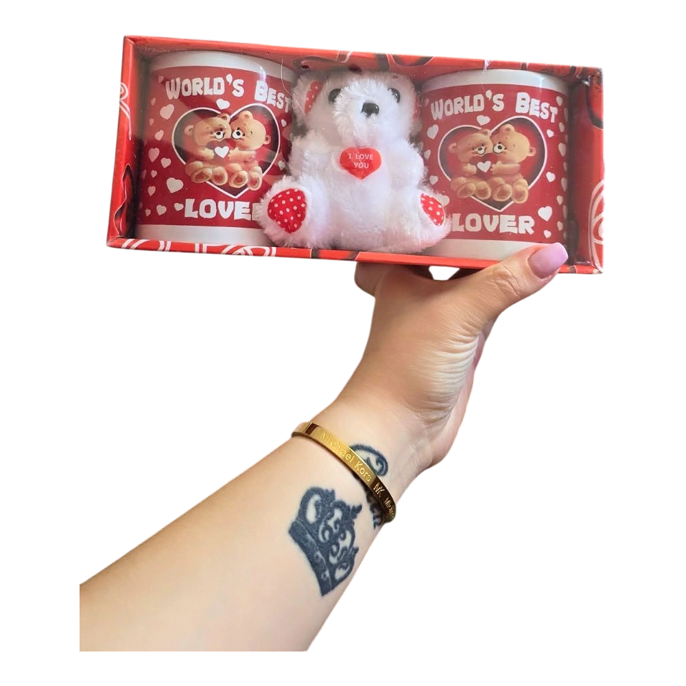 Gift set consisting of two mugs with teddy bear images and a small plush teddy bear.