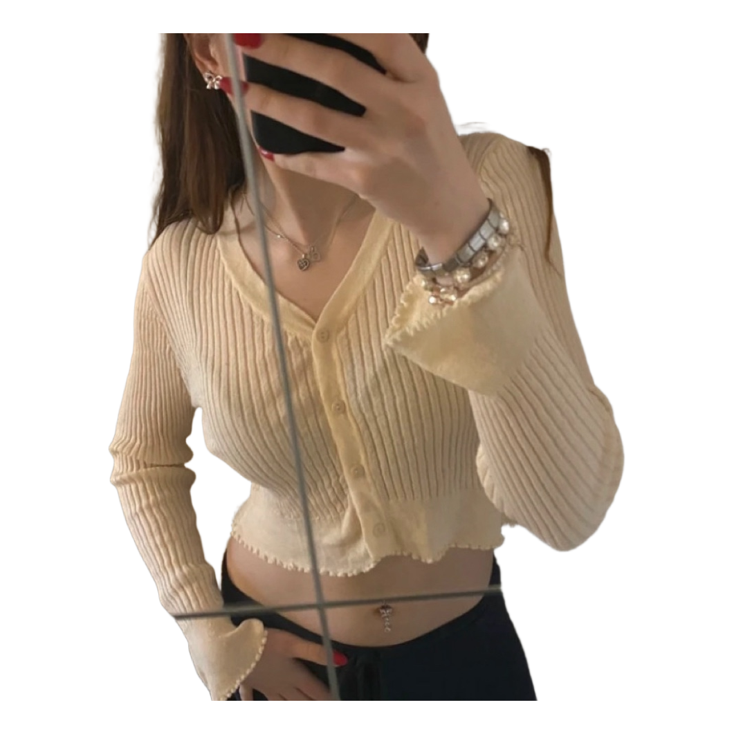 Cropped cream cardigan with long sleeves and front button fastening. Features delicate ribbed texture and lettuce edge hem.