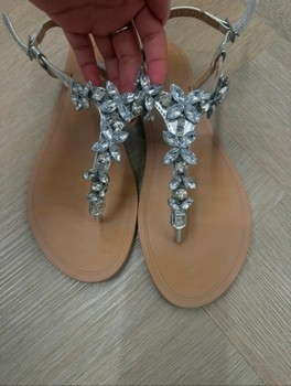 Silver flat sandals with rhinestone floral embellishments. Ankle strap closure. Size EU 39.