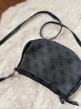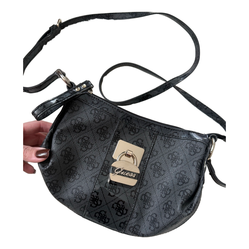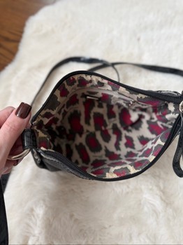 Small black shoulder bag with the brand logo pattern and a decorative metallic lock detail. Includes a leopard print interior lining.