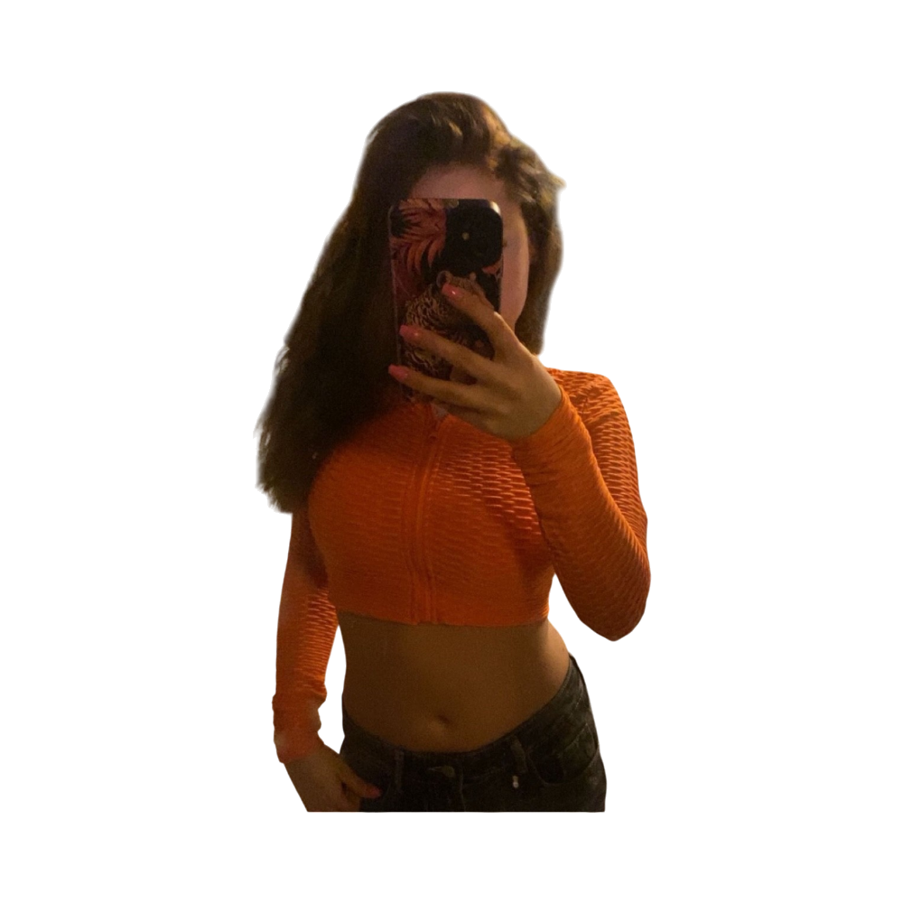 Brick-toned ribbed long-sleeved crop top, with zipper.