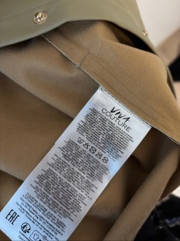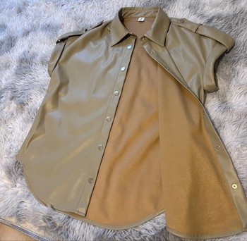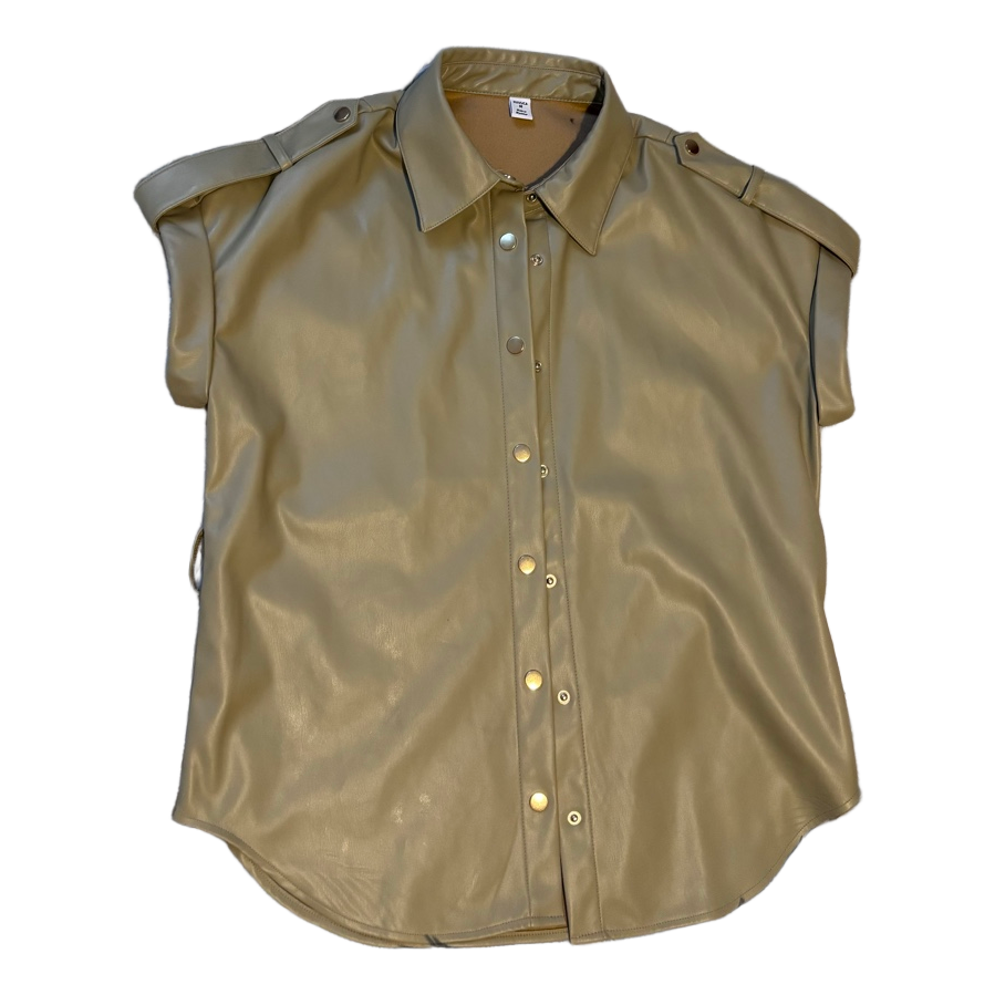 Beige faux leather shirt with snap button closure. Features short sleeves and a collared neckline.