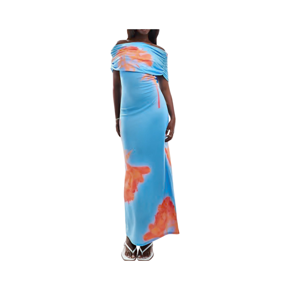 Long blue midi dress, with orange floral pattern and pleated bodice. Suitable for more formal occasions.