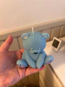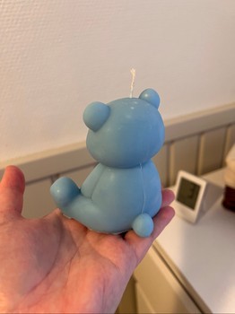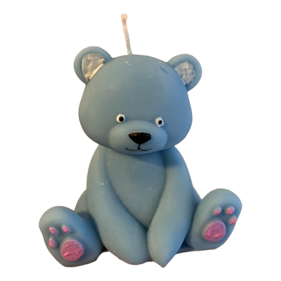 Light blue teddy bear-shaped candle. Sitting position and painted details