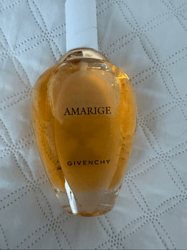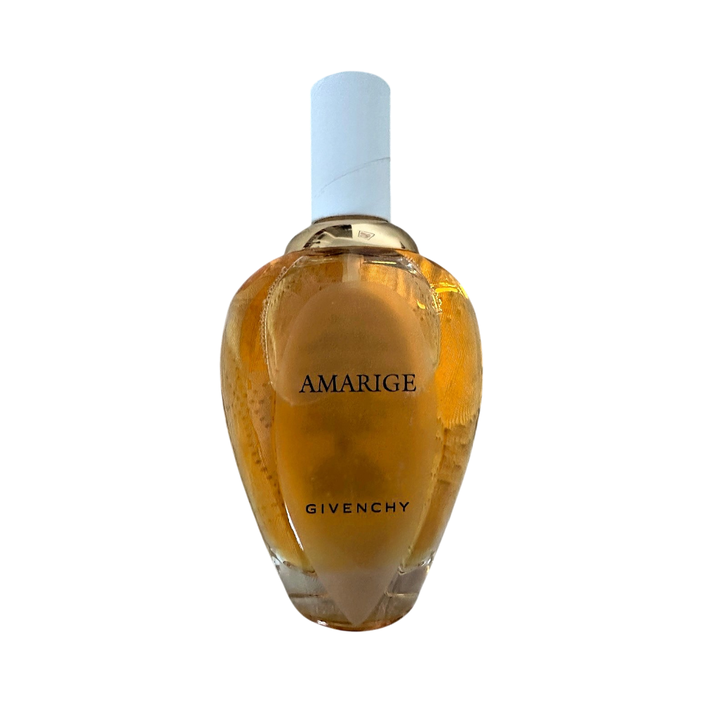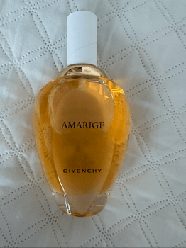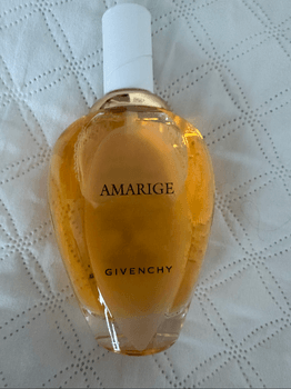 Amarige perfume by Givenchy. Stylish, classic bottle containing gold-colored liquid. Suitable for women.