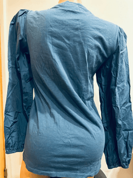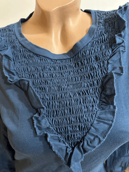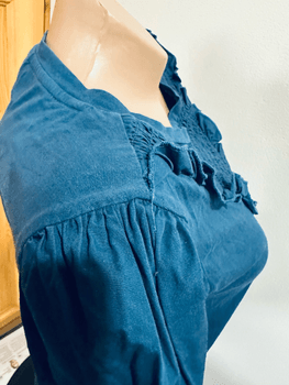 Dark blue maternity shirt from Mamalicious. Smock gathering and ruffles at the front. Perfect for the expectant mother – 100% cotton, light and breathable.