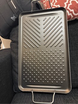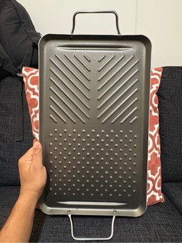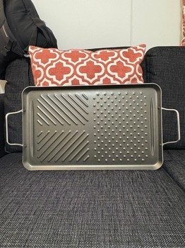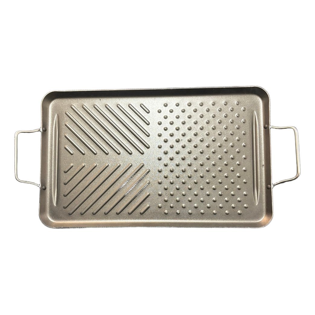 Rectangular non-stick grill pan with metal handles. Features a dual-textured surface with grooves and raised dots.