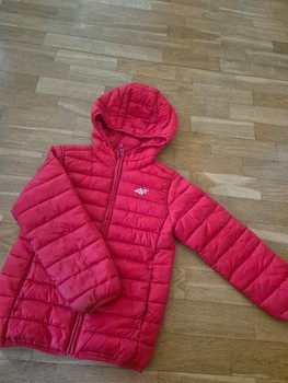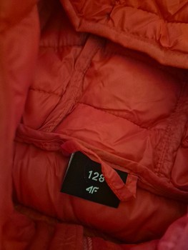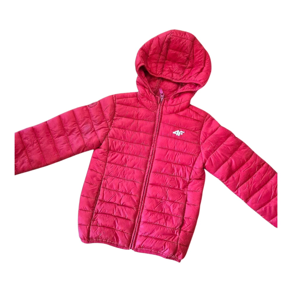 Sarkana jaka ar kapuci. Priekšpusē rāvējslēdzējs un 4F logo.