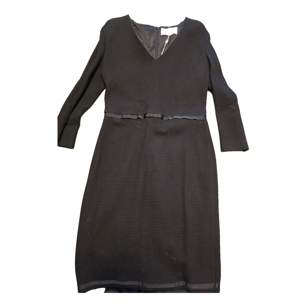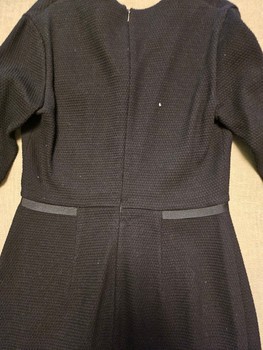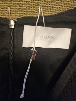 New. Black textured dress from Boss Hugo Boss. Features a V-neckline and decorative ribbon waist detail.