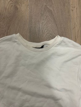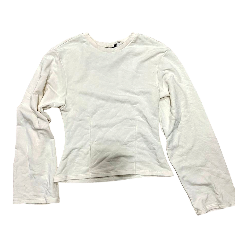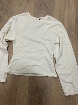 White long-sleeved shirt with a round neckline and shaped stitched details at the front. Lager 157