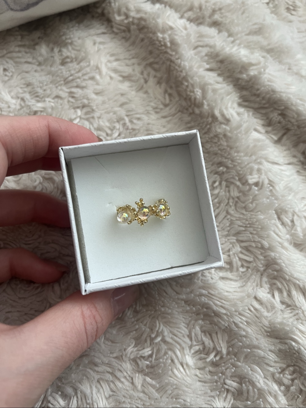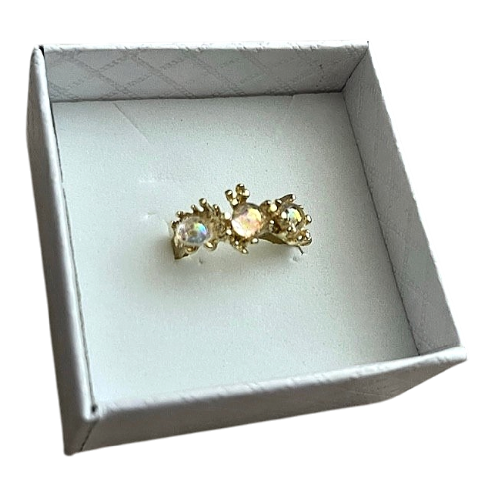 Gold-toned ring with three light stones.