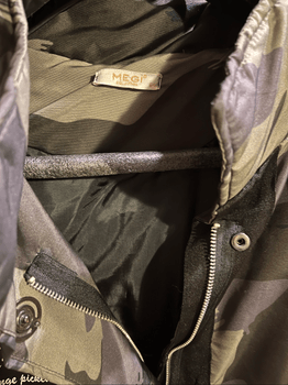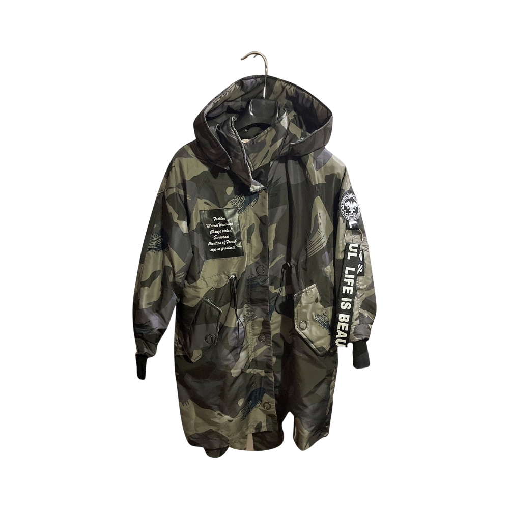 Parka coat featuring a camouflage design with hood and multiple pockets. Includes printed text details and a zip closure.