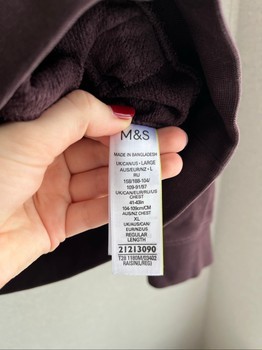 M&S zip-up sweatshirt featuring a colorblock design in dark blue, white, and deep purple. Includes side pockets. Size L.