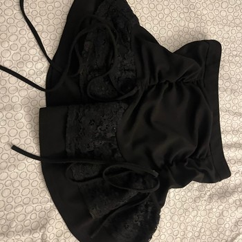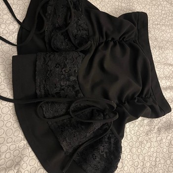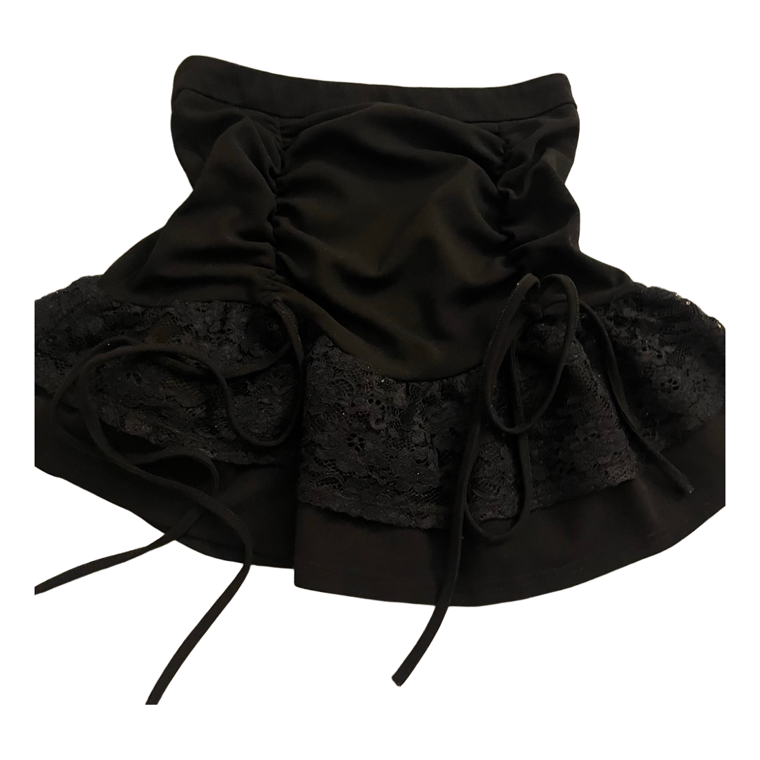 Black mini skirt featuring ruched detailing and lace inserts with tie-up accents.
