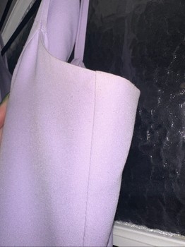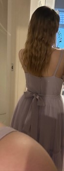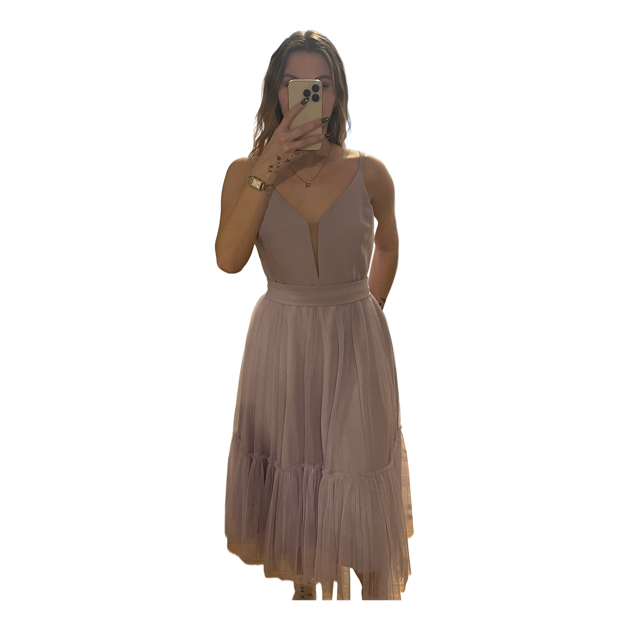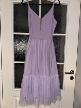 Lilac midi dress featuring a deep V-neckline with a sheer insert and a tiered tulle skirt. Includes a matching tie-waist detail.