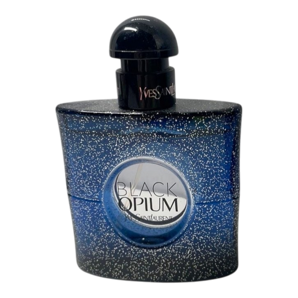 Black Opium perfume bottle with glitter finish. Features Yves Saint Laurent branding on the cap and label.