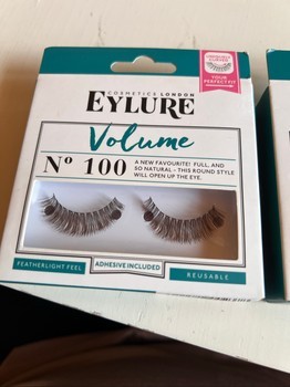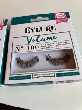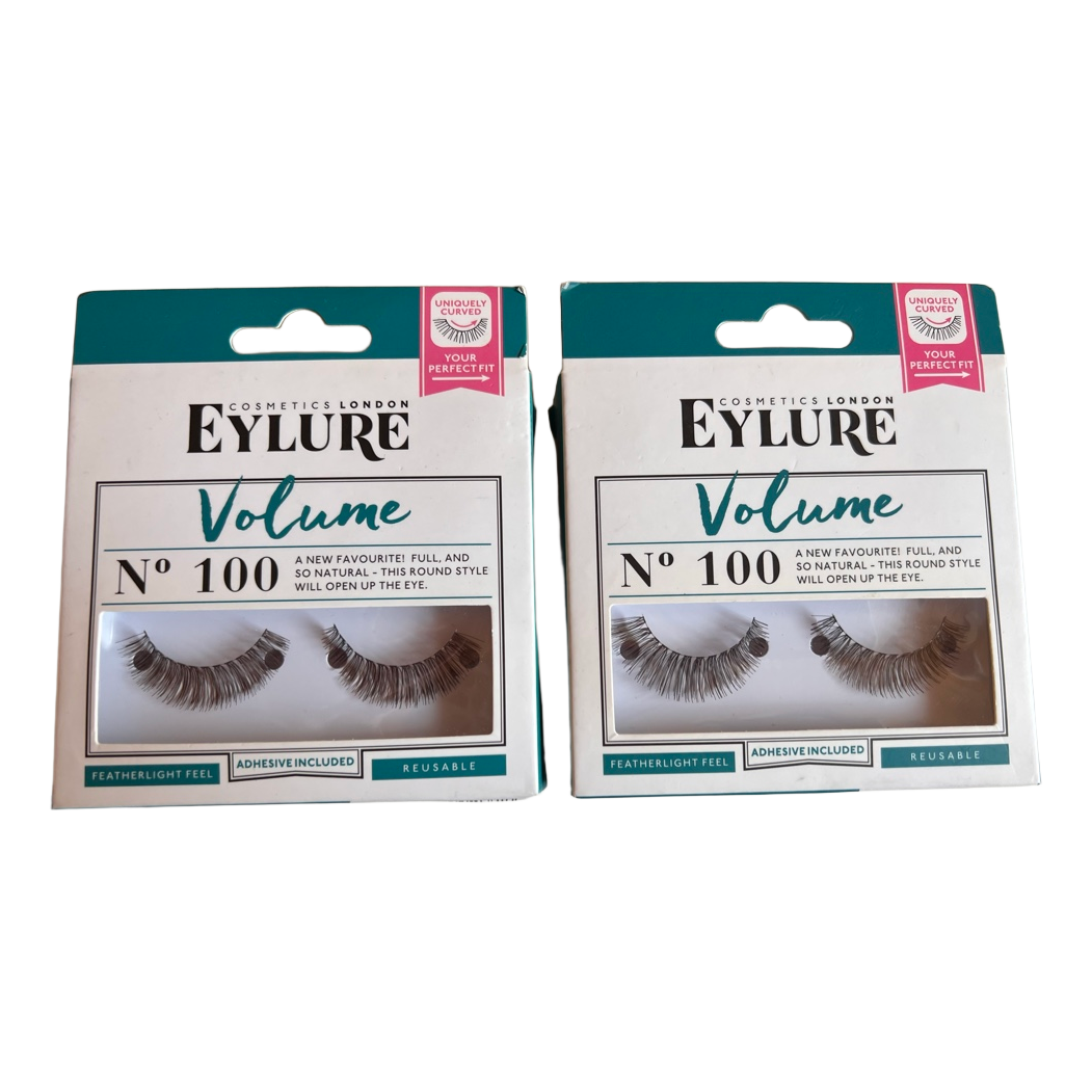 Two packs of Eylure Volume number 100 false eyelashes. Includes adhesive glue. Unopened packages.