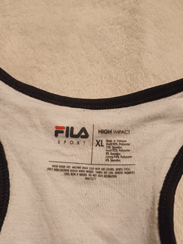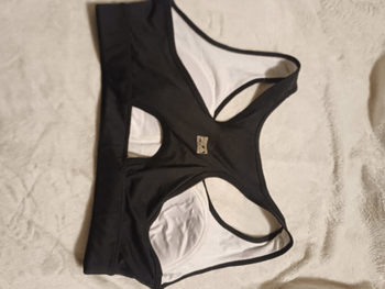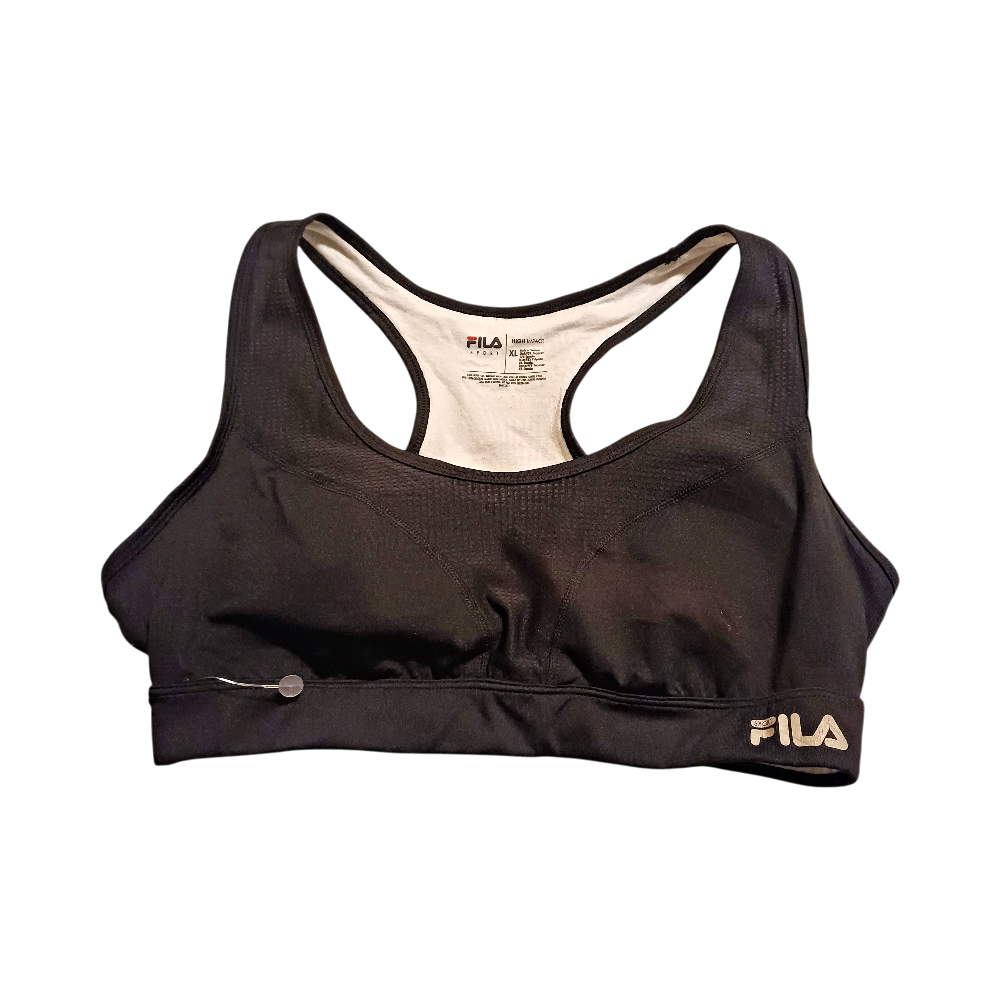 High-support sports top, with black and white colors. Size XL. Material contains polyester and spandex.