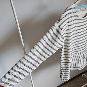 Comfortable and stylish soft top featuring classic black/cream stripes, decorative button details along the sleeves, and a front kangaroo pocket for a relaxed casual look. Perfect for everyday wear, layering, or cozy outfits.