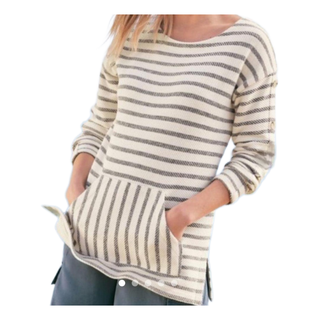 Soft Surroundings Striped Sweatshirt PM Coastal Nautical Casual Chic Button Sleeve Lounge Top