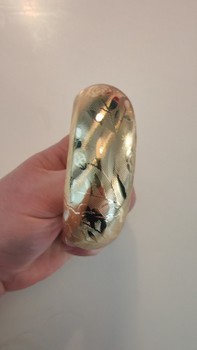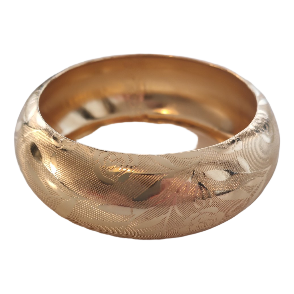 Golden wide bracelet with engraved pattern.