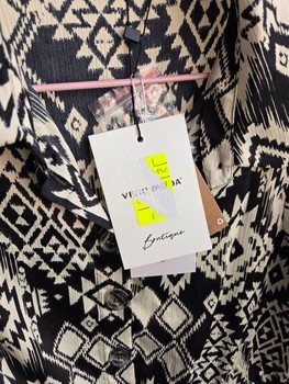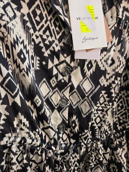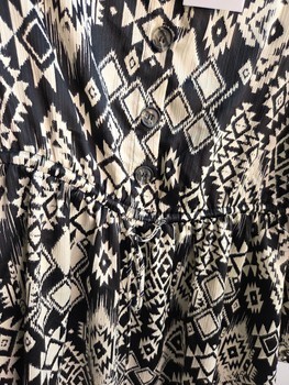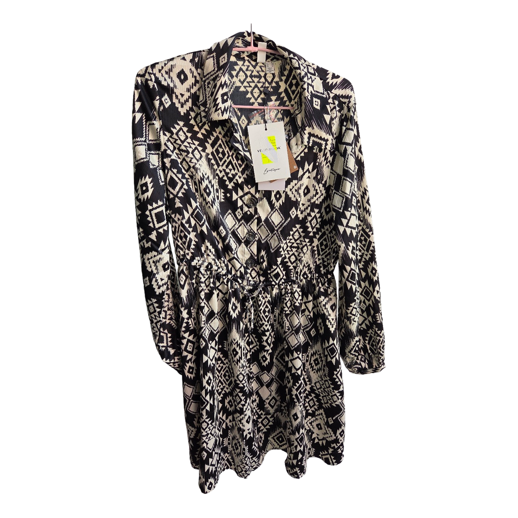 Black and white long-sleeved patterned dress with a button-down front and cinched waist. Size L, made of 100% recycled polyester.