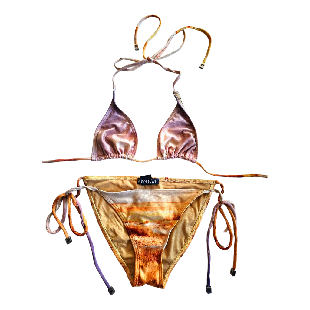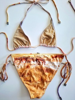 Two-piece high quality bikini featuring a zebra landscape print. The top has tie strings with metal hardware, and the bottom is adjustable with side ties, thus fits many sizes.
