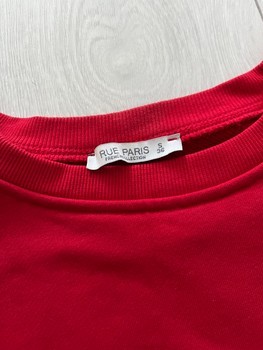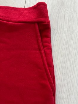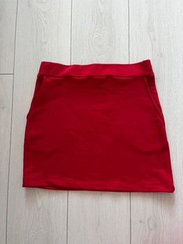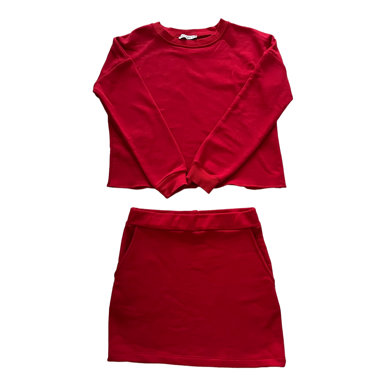 Matching red two-piece set featuring a long-sleeved sweatshirt and a mini skirt with pockets. Size S.