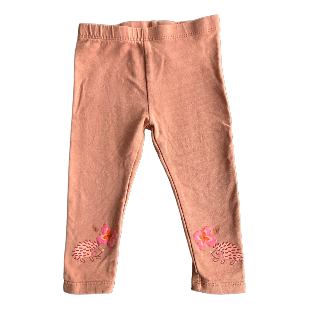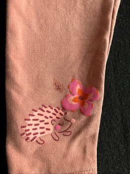 Light pink baby leggings with a hedgehog and flower image on the legs. Size 80, brand du pareil au meme. Runs small, I would have used them earlier. Intact and in good condition, also the knees and crotch. The seam stitches on the back are visible, shown in the last picture.