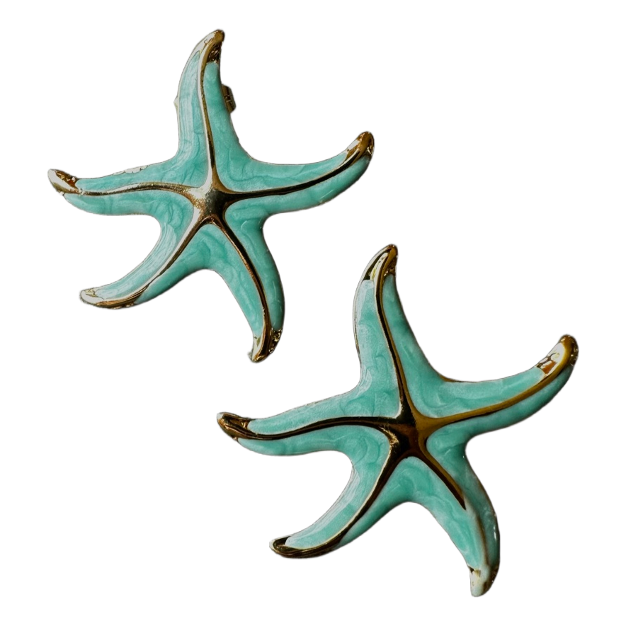Mint green starfish stud earrings with gold-tone detailing. Measures approximately 4 cm.