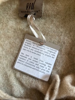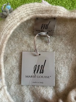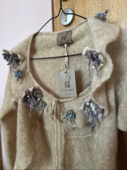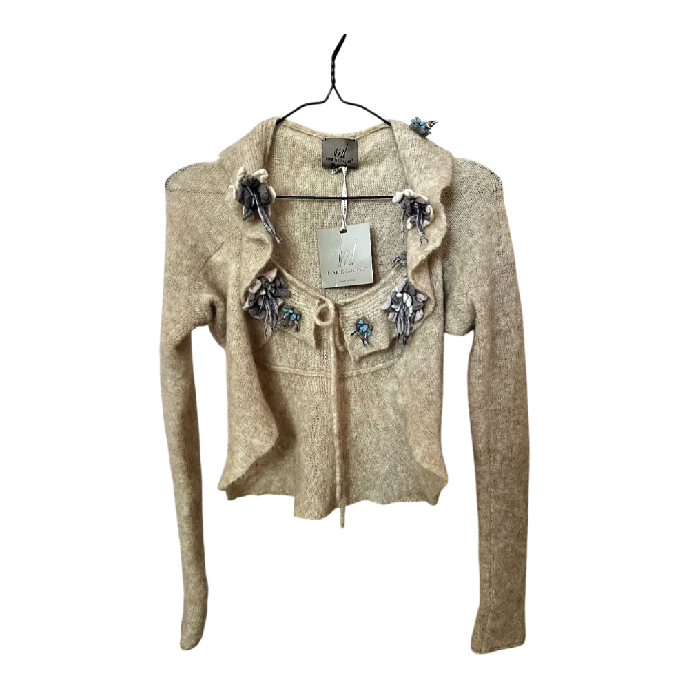 Beige cardigan with ruffled collar. Features delicate floral details on the neckline. Made in Italy with a wool and polyester blend.