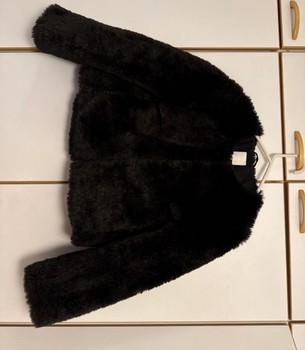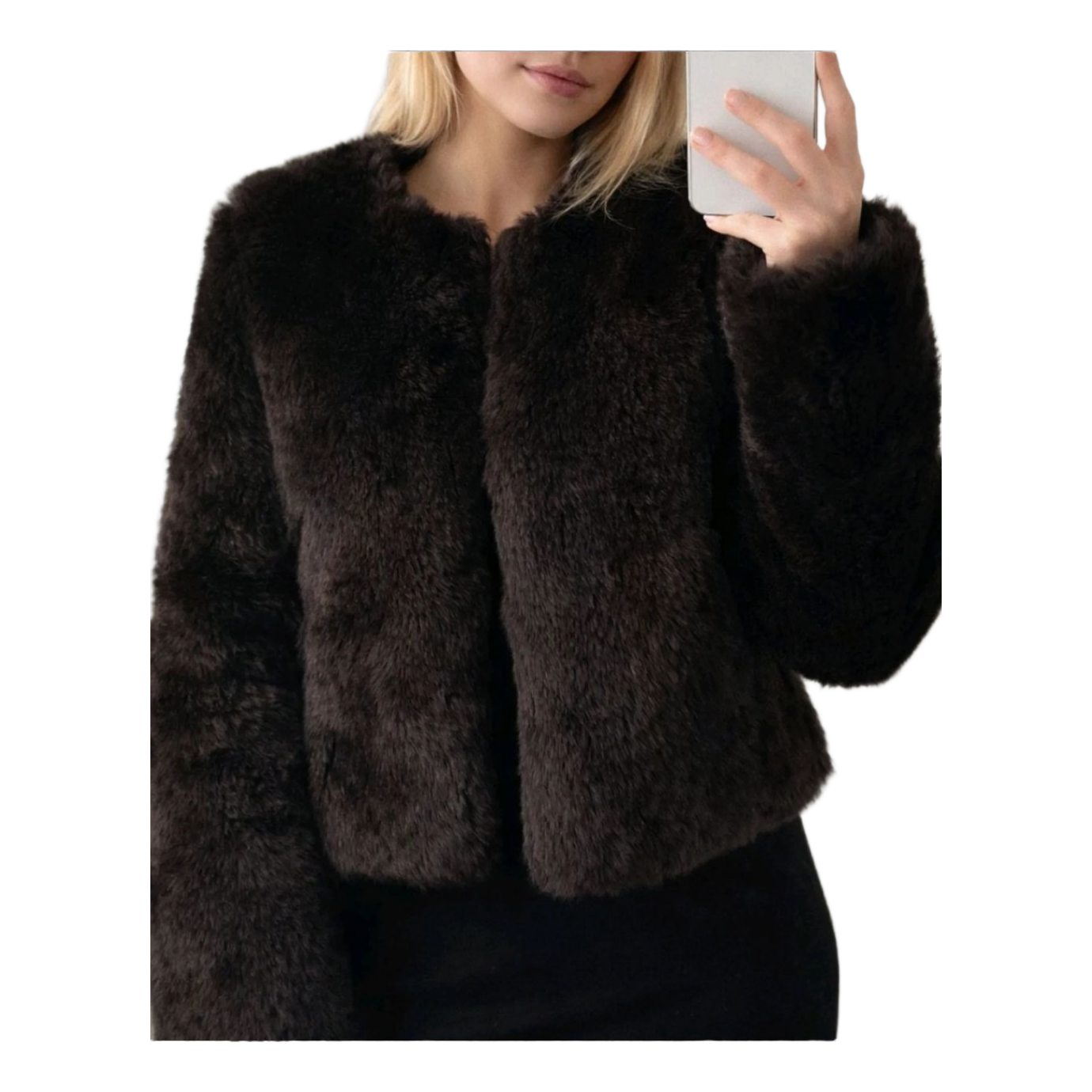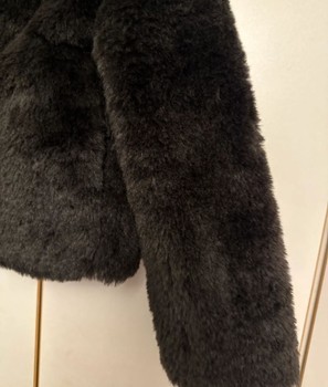 Dark brown / black faux fur jacket with a round neckline. Fully lined. Size S.