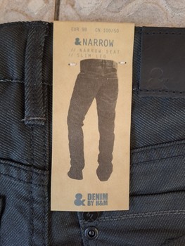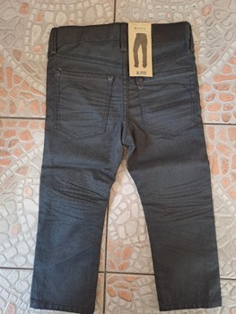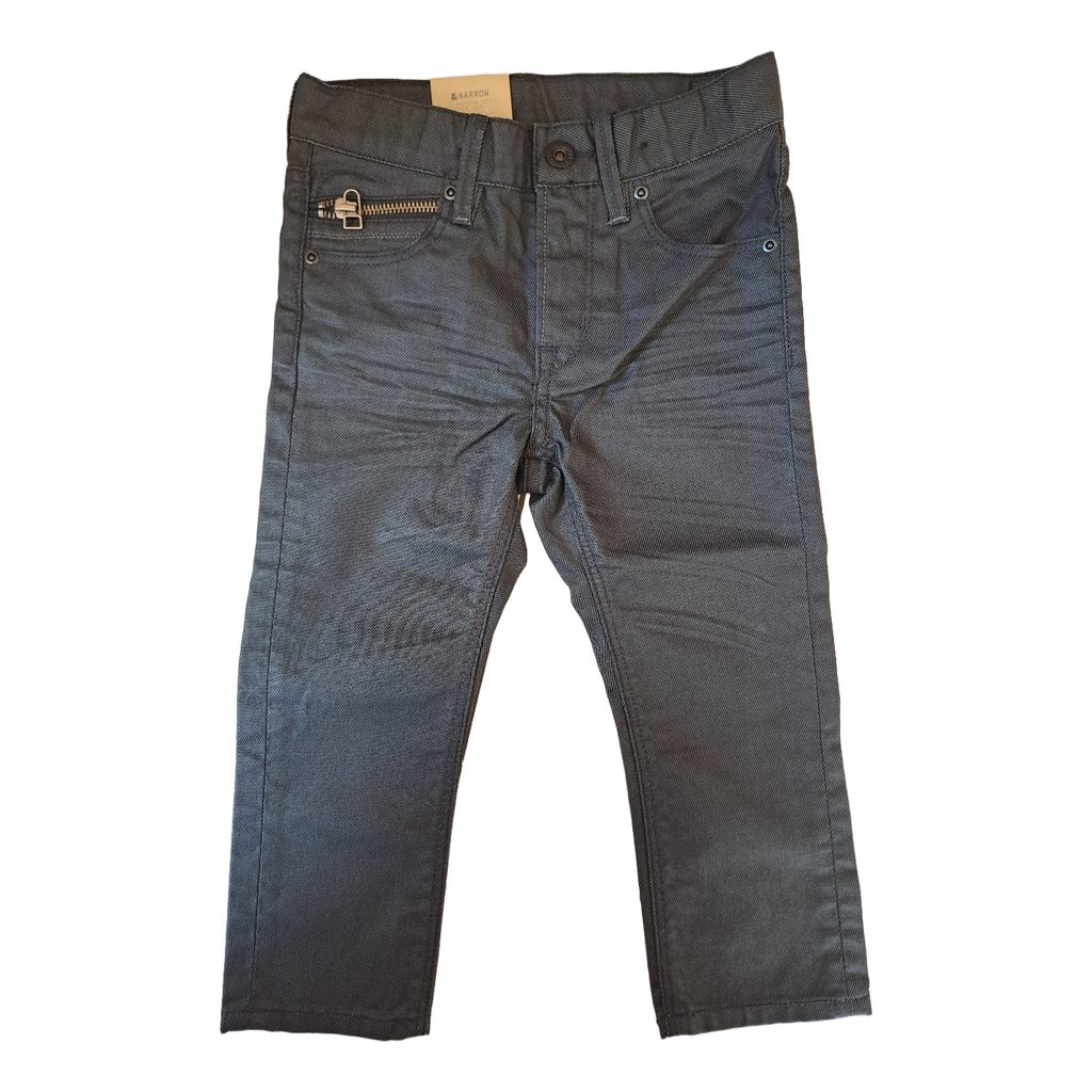 Black denim jeans with a narrow seat and slim leg. Brand tag attached. Size 98.
