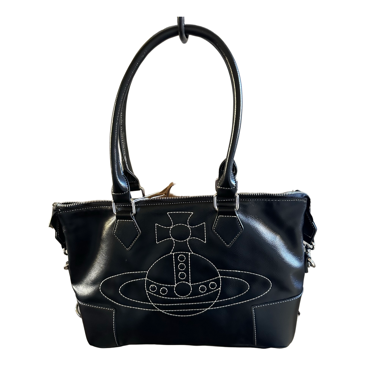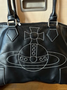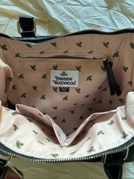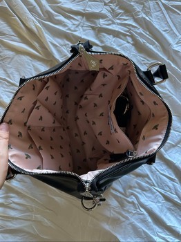 Black handbag with iconic white stitching logo detail. Includes a pale pink interior lining with branded pattern and a zip closure.