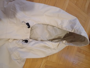 White Helly Hansen outdoor jacket with hood. Size S. There is something small.