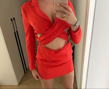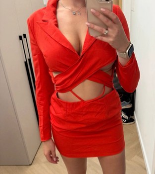 Red blazer-style mini dress with cut-out details at the waist. Featuring long sleeves and a blazer collar. Brand tag attached, size 10.