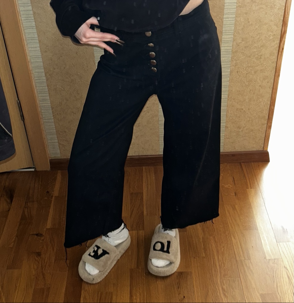 Black high-waisted denim jeans with button fastening and uneven hem.