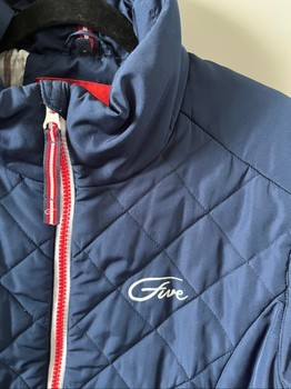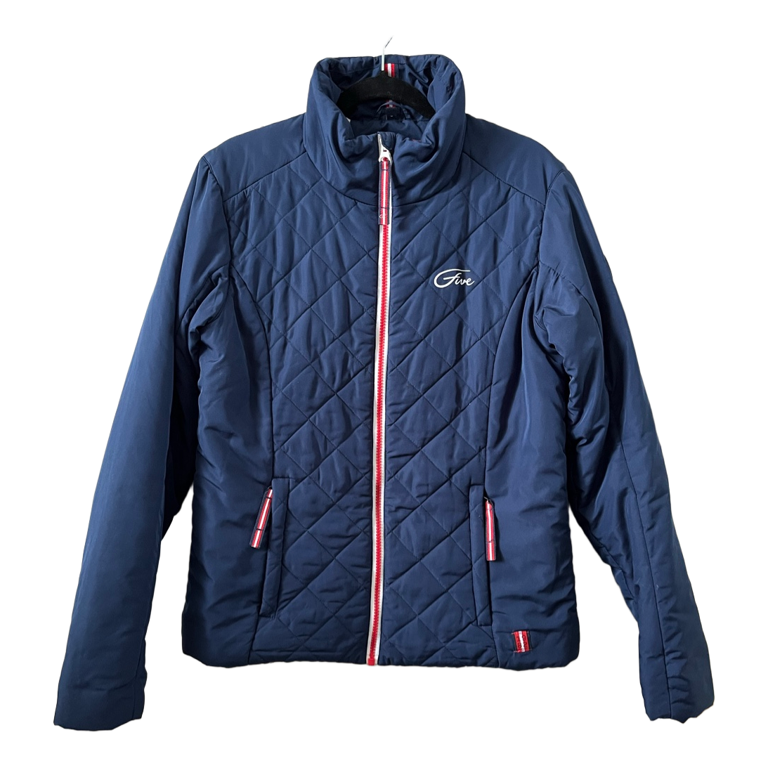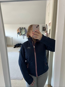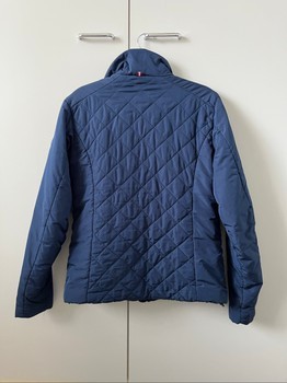 Navy blue quilted jacket with red and white details. Size 42. Fits more like size M. There is a small dirt stain on the front. The jacket has been used near horses.