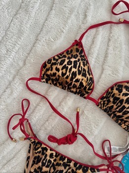 Leopard print bikinis with red ties and gold-colored details. Top size L and bottom size M, can be adjusted to fit. Completely new!