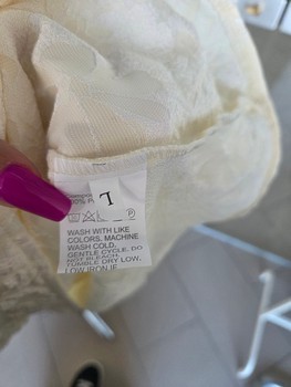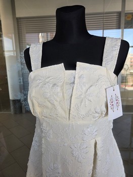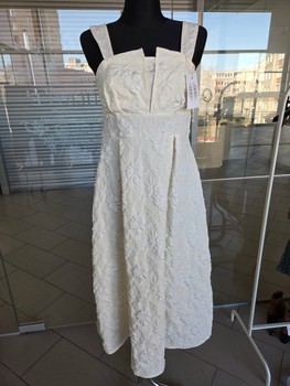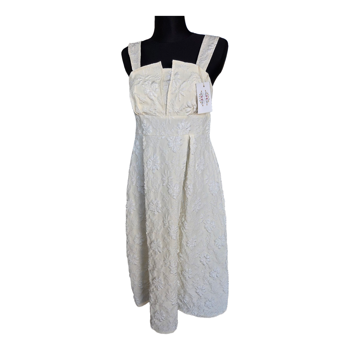 Textured midi dress in cream with a floral pattern and wide straps. Made from 100% polyester, size L.