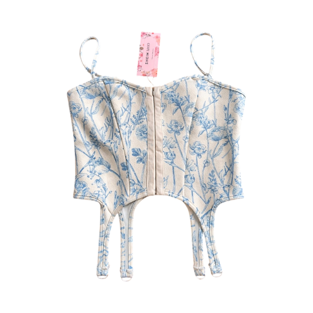 A cream and blue floral print corset top from Shein Mod. It features thin shoulder straps, a front hook-and-eye closure, and garter-style straps at the hem with metal rings.