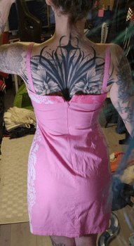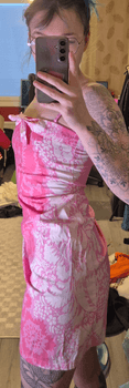 The following quote from Marimekko's Pre-loved section regarding this same dress: This is a pink fitted and sleeveless dress in the Ananas pattern with a decorative bow and a zip on the backside. Design by Mika Piirainen.