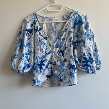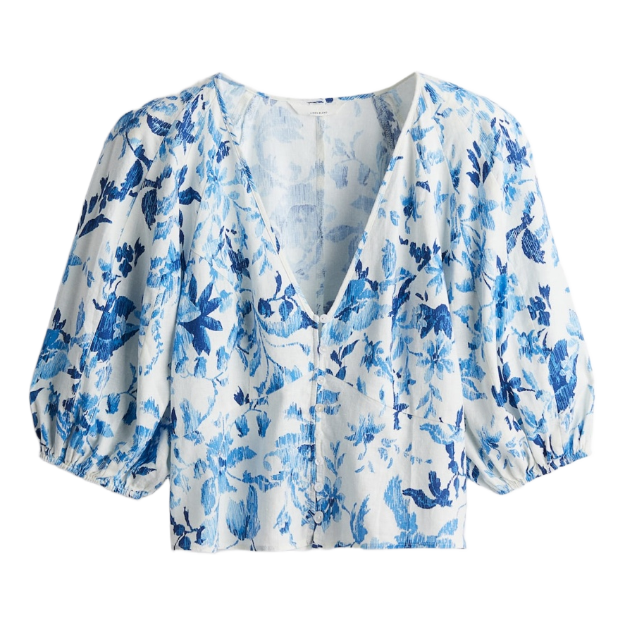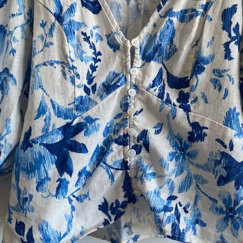 Beautiful H&M summer cropped top with puff sleeves and a flattering V-neckline. Features a button-front design and a breathable linen-viscose blend (54% linen), making it lightweight and comfortable for warm days.