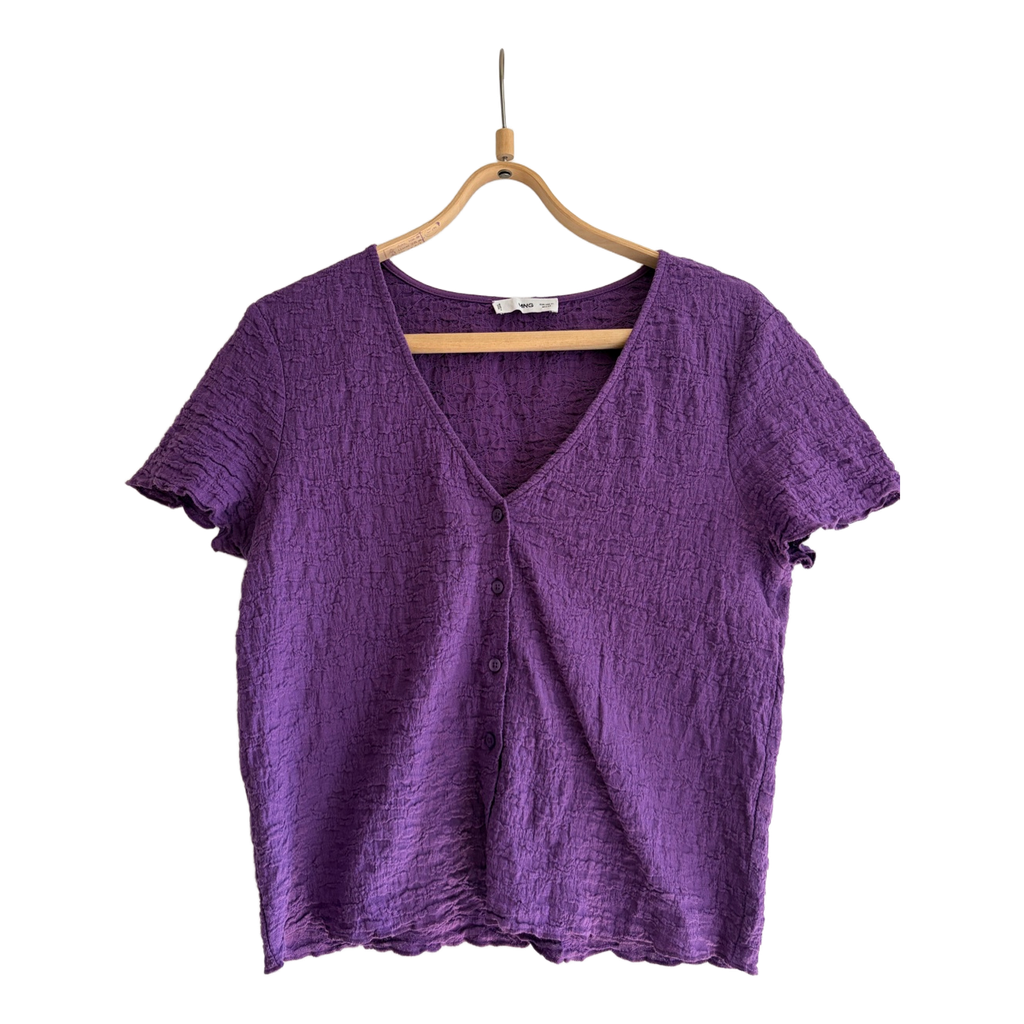 Short-sleeved purple top with a textured finish and a button-down front. Features a V-neckline. From Mango, size XL.