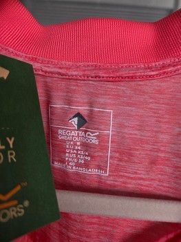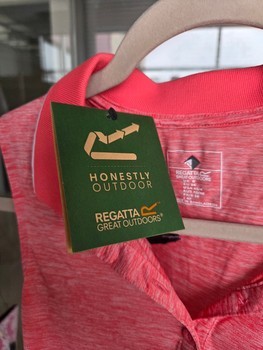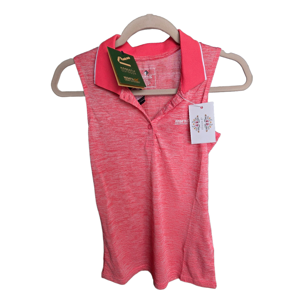 Pink sleeveless polo shirt with button placket. Brand name on chest.