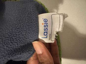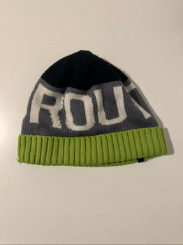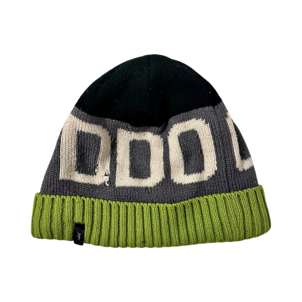 Green beanie with grey and black coloring. White logo on the front. Material is not visible.